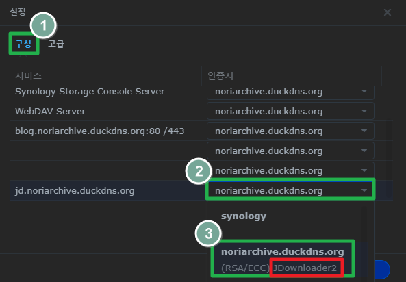구성 탭에서, 추가한 JDownloader2 역방향 프록시의 인증서를 방금 추가한 인증서로 변경합니다.
