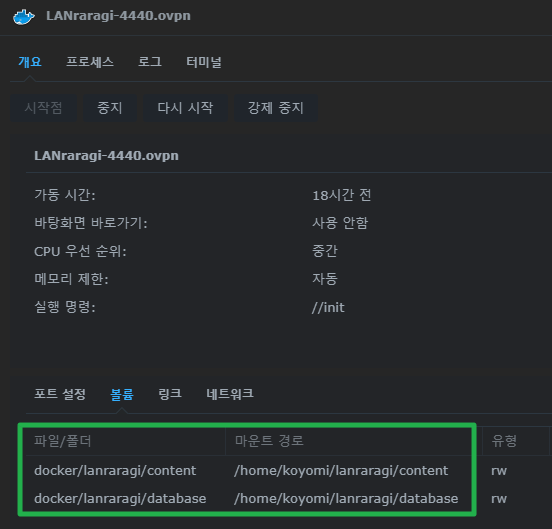 예를 들면, 필자는 /volume1/docker/lanraragi/database 경로를 컨테이너가 인식할 수 있게끔 맵핑하였습니다.