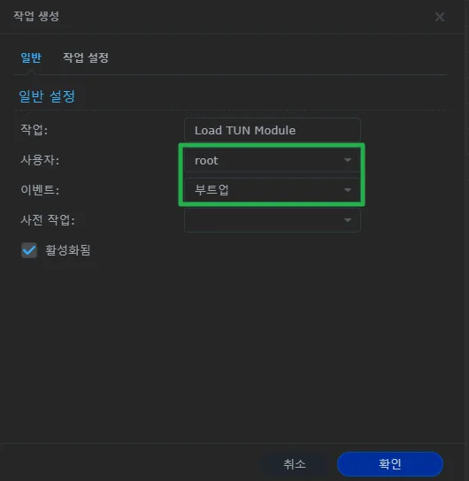 일반 탭에서 사용자를 root로, 이벤트를 부트업으로 지정합니다.