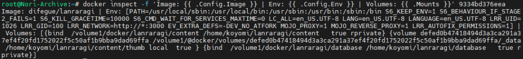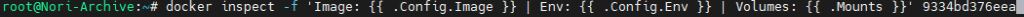docker inspect -f 'Image: {{ .Config.Image }} | Env: {{ .Config.Env }} | Volumes: {{ .Mounts }}' [컨테이너 ID]