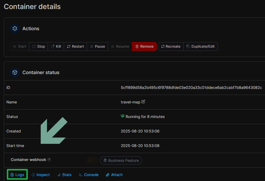 이제 Portainer의 Containers에서 travel-map의 로그를 확인합니다.