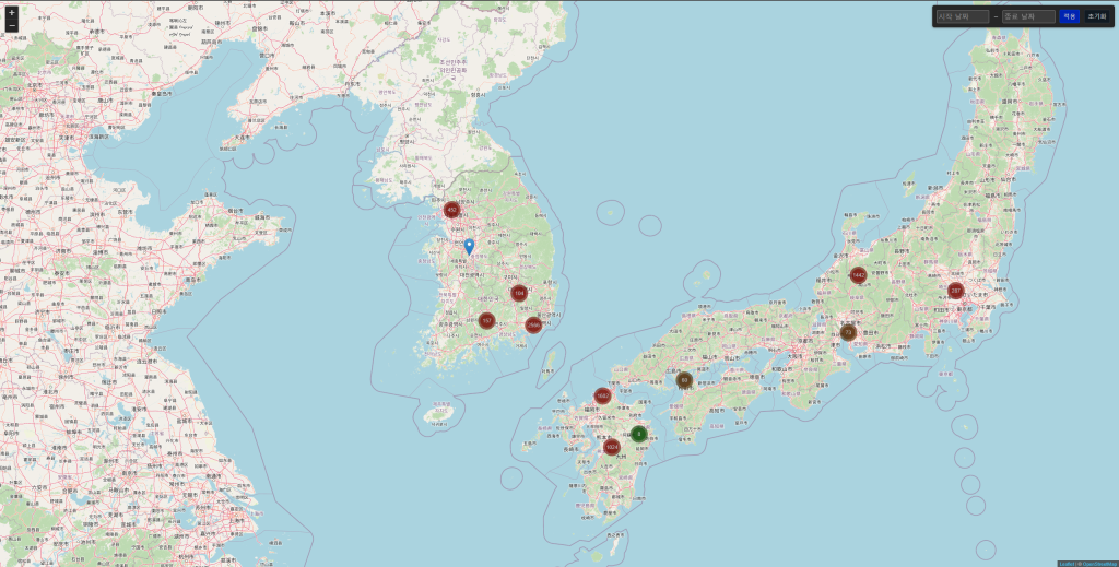 - 한 지역에 사진이 몰려있으면 자동으로 그룹화(클러스터링)하여 지도를 깔끔하게 보여주고,