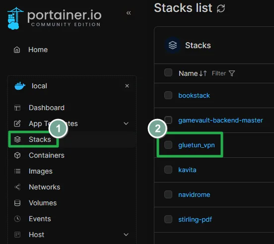 Stacks에서 gluetun_vpn을 클릭합니다.