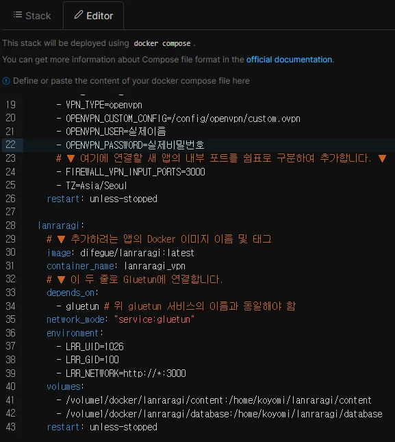 이제 여러분은 Portainer에서 스택을 활용하여 Gluetun 컨테이너를 설정하고,