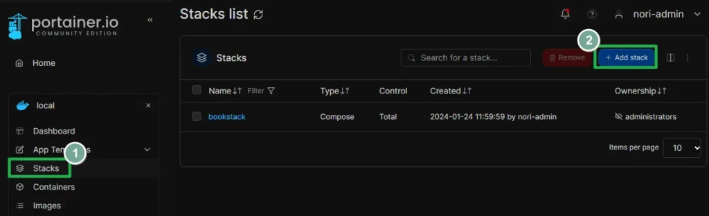 이후 Portainer에 접속하여, Stacks > Add stack을 클릭합니다.