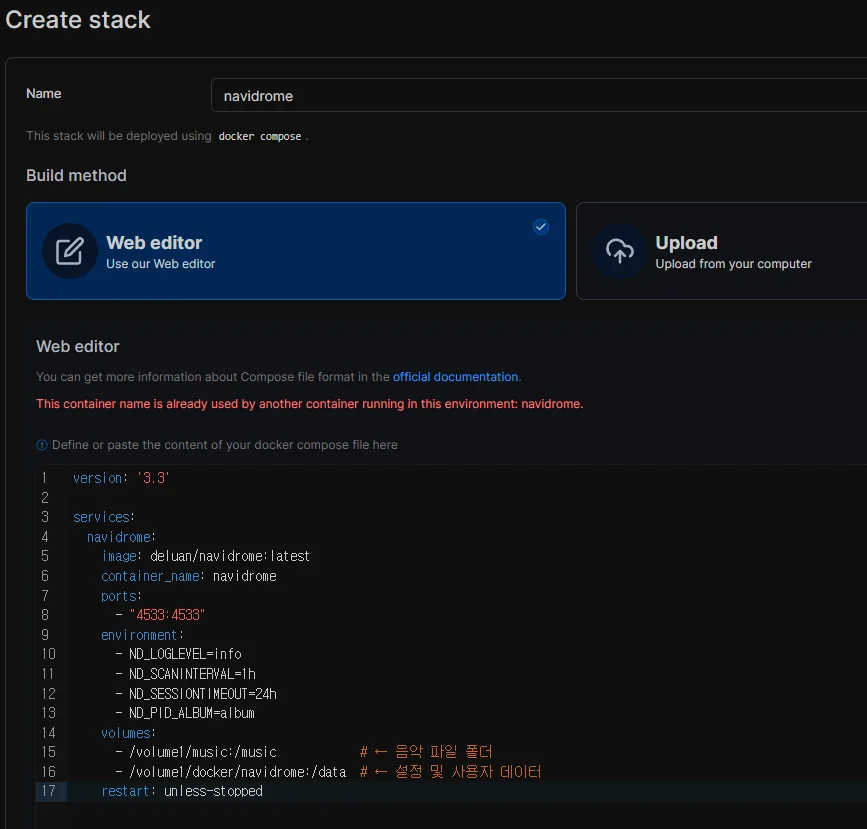 Web editor 부분에 아래의 docker-compose 코드를 붙여 넣습니다.