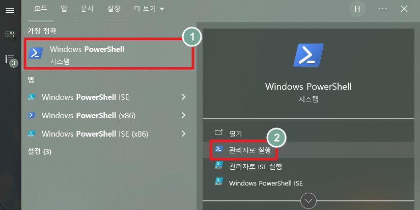 먼저 윈도우 키를 누르고 powershell을 검색하여 관리자로 실행합니다.