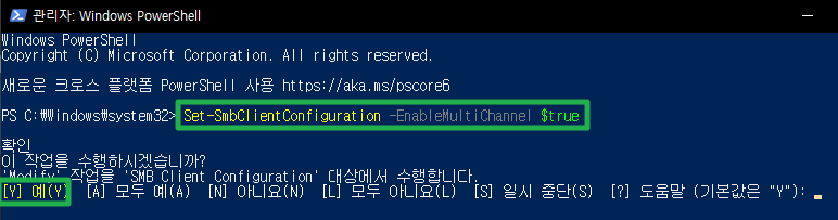 이후 SMB 멀티채널을 활성화하는 명령어를 복사하여 Ctrl + V로 붙여 넣고 Y를 입력합니다.