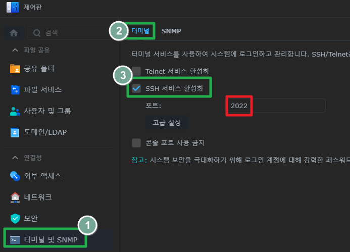 시놀로지의 제어판 > 터미널 및 SNMP에서 SSH 서비스를 활성화합니다.