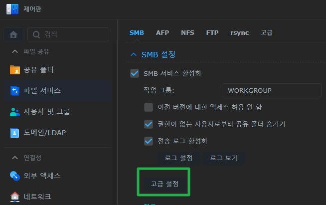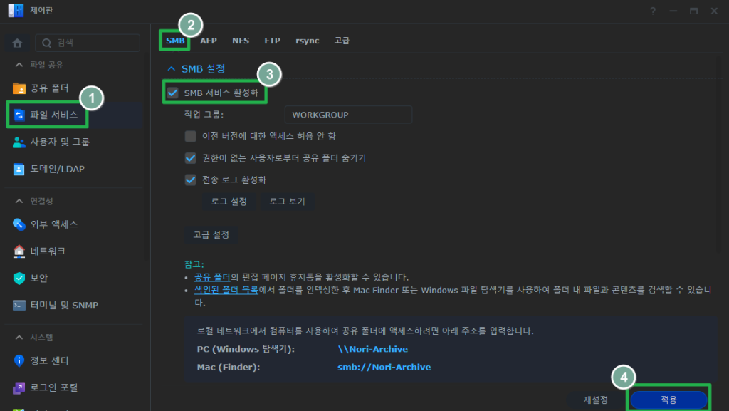 제어판 > 파일 서비스 > SMB에서 SMB 서비스 활성화를 끄고, 적용을 누릅니다.