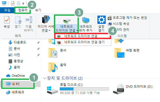 윈도우의 파일 탐색기를 켜고, 내 PC를 클릭합니다.