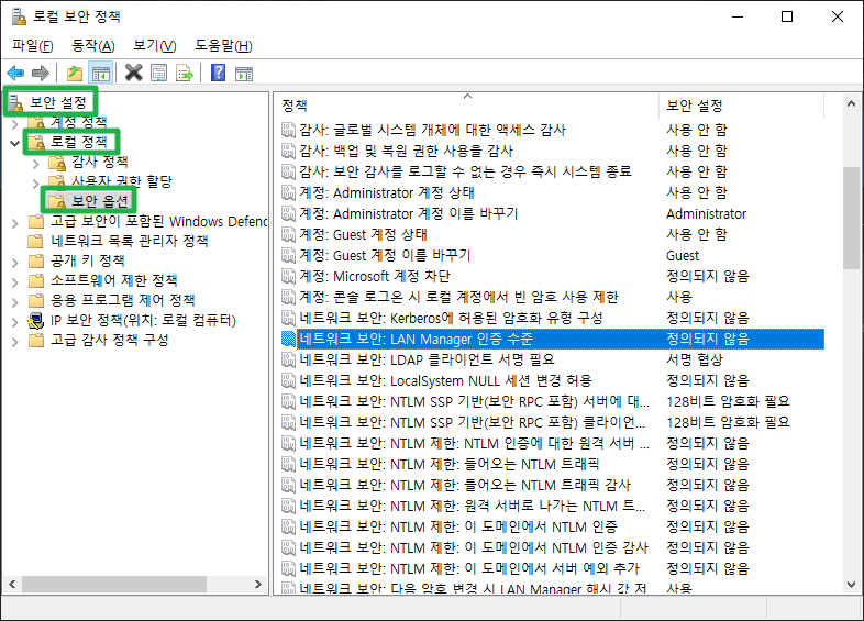 보안 설정 > 로컬 정책 > 보안 옵션에 진입하여
