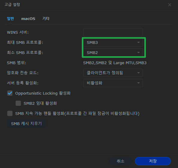 시놀로지 제어판 > 파일 서비스 > SMB > 고급 설정 > 일반 > 암호화 전송 모드에서