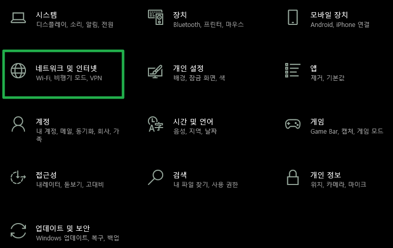 설정에서 네트워크 및 인터넷에 진입합니다.