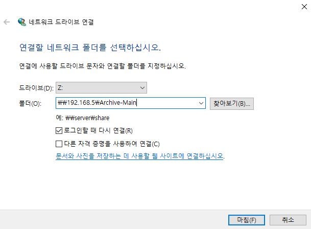 폴더 부분에 작성 양식에 따라 IP와 공유 폴더를 입력합니다.