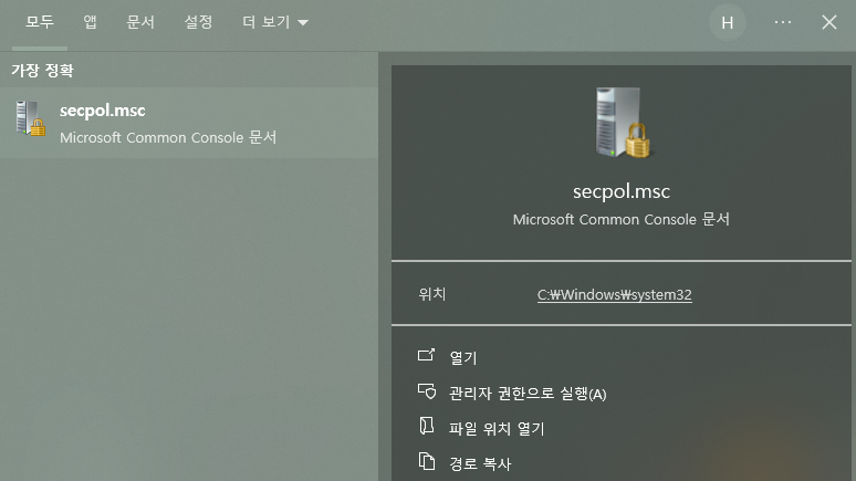 윈도우 키를 누르고 secpol.msc를 입력하여 실행합니다.
