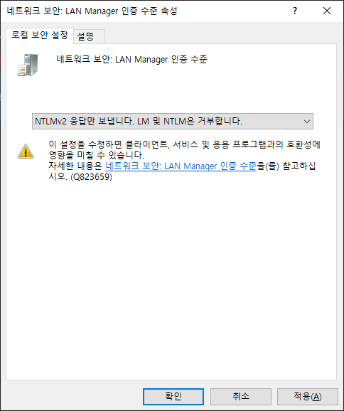 NTLMv2 응답만 보냅니다. LM 및 NTLM은 거부합니다를 선택 후 저장합니다.