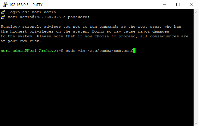 이 명령어는 SMB 관련 설정을 root 권한으로 편집하겠다는 내용이기에, 비밀번호 입력을 요구합니다.