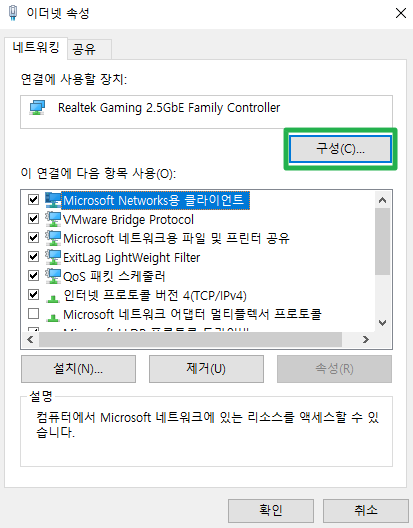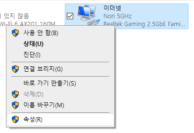 변경이 필요한 이더넷을 우클릭하여, 속성에 진입합니다.