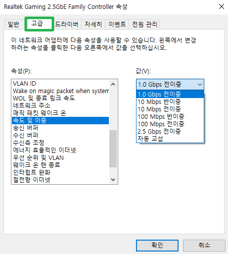 고급 탭에서 속도 및 이중을 클릭하고, 값을 변경합니다.