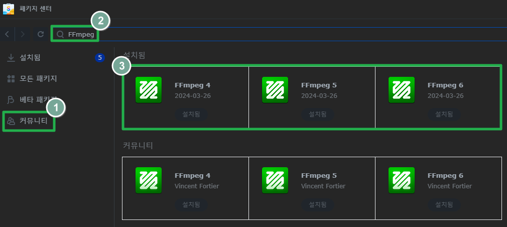 패키지 센터에 추가된 커뮤니티 탭에서, FFmpeg를 검색합니다.