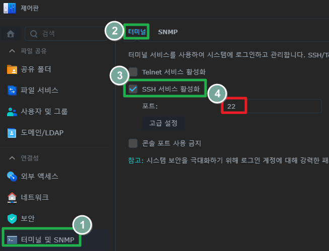 제어판에서 터미널 및 SNMP > 터미널 > SSH 서비스 활성화에 체크하고 저장합니다.