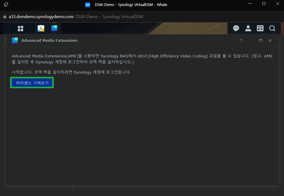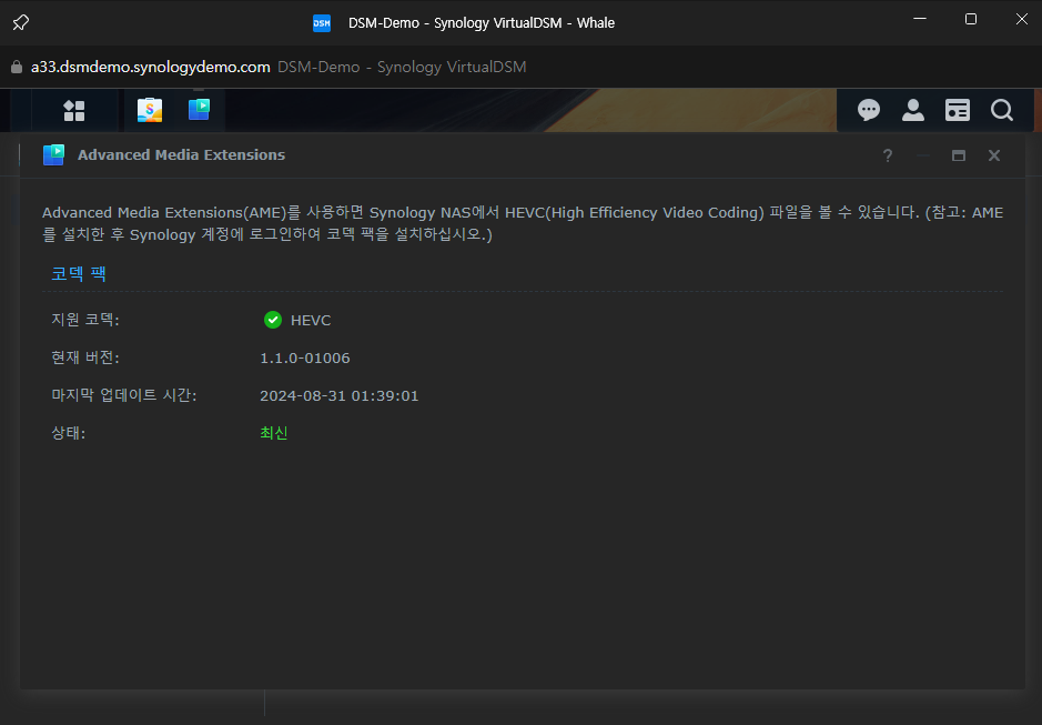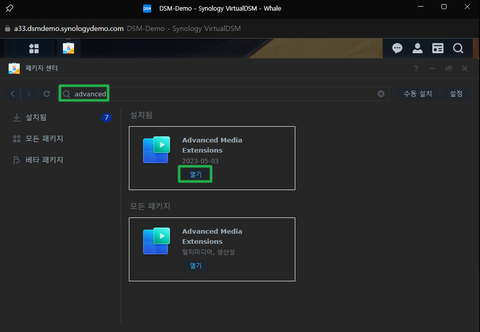 데모에서 패키지 센터를 실행하고, Advanced Media Extensions를 엽니다.