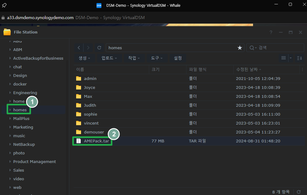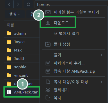 이후 파일 스테이션을 실행하여 homes 경로에서 AMEPack.tar을 확인할 수 있습니다.