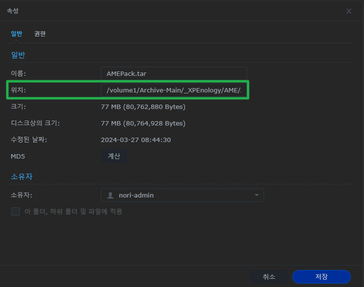 다운로드한 AMEPack.tar 파일을 시놀로지 / 헤놀로지에 업로드합니다.