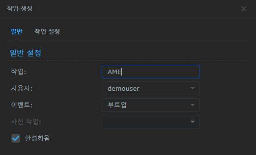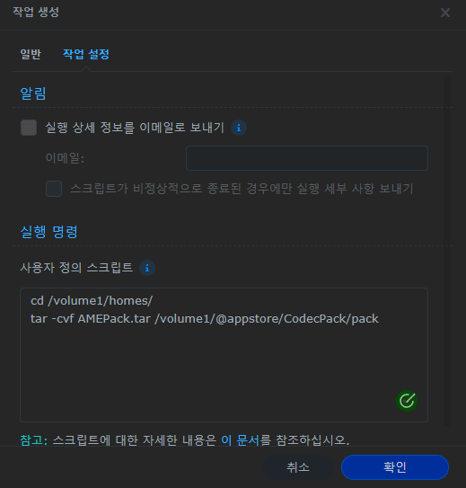 작업 설정 탭에서 아래의 사용자 정의 스크립트를 입력하고 확인을 클릭합니다.