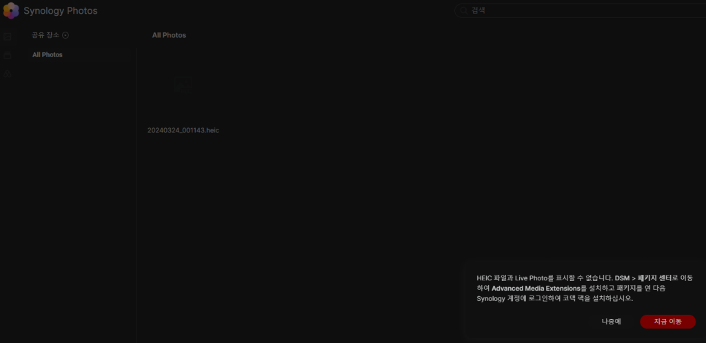 Synology Photo에서 HEIC 및 HEVC 파일을 정상적으로 지원하려면, Synology Photo 또는 File Station을 사용해 파일을 업로드하거나 이동하는 것이 권장됩니다.