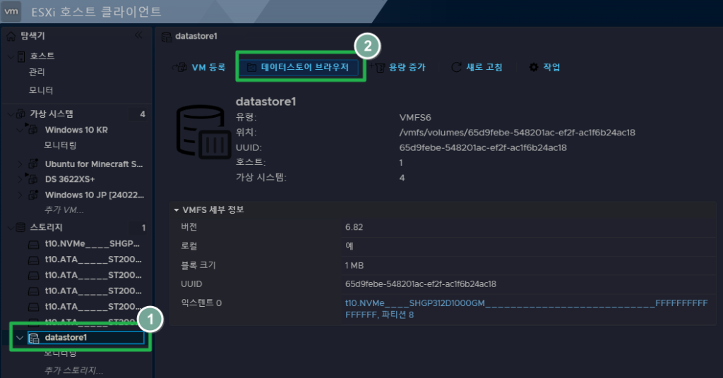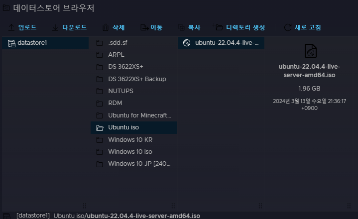 다운로드한 Ubuntu.iso 파일을 ESXi의 데이터스토어 브라우저를 통해 적당한 경로에 업로드합니다.