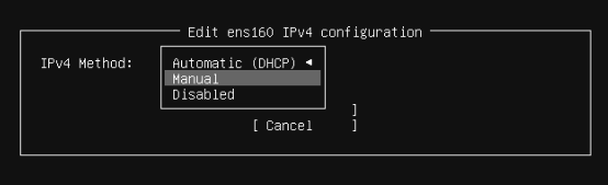 혹은 ens160을 선택하여 수동으로 IP를 할당하여도 됩니다.